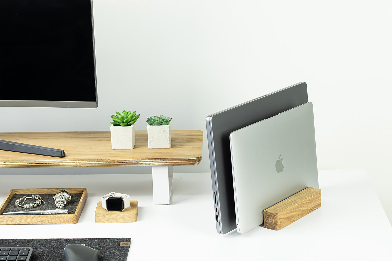 Indem Sie Ihren Laptop/Ihr Tablet vertikal aufbewahren, sparen Sie Platz auf Ihrem Schreibtisch!