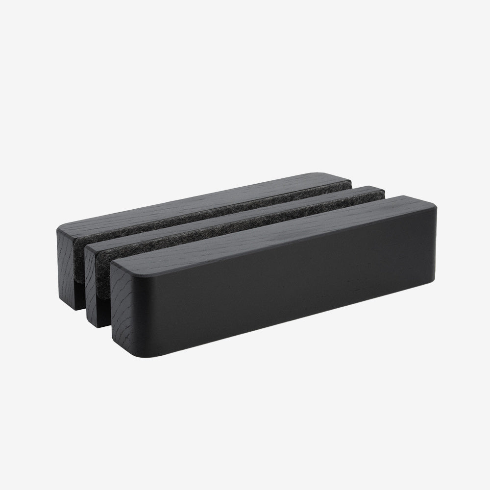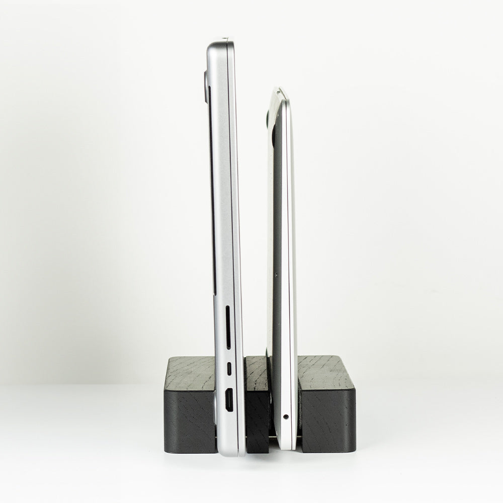 Verleihen Sie Ihrem professionellen Ambiente mit dem Dual-Laptop-Ständer einen Hauch von Eleganz. Er ist tadellos in einem scharfen, rechteckigen Profil aus erlesenem, schwarz lackiertem Eichenholz geformt. Dieser Ständer verkörpert moderne Handwerkskunst und bietet eine stabile Plattform für Dual-Laptop-Anordnungen, während die schwarze Oberfläche für einen Hauch von Raffinesse sorgt und subtile Andeutungen der natürlichen Maserung der Eiche bewahrt.