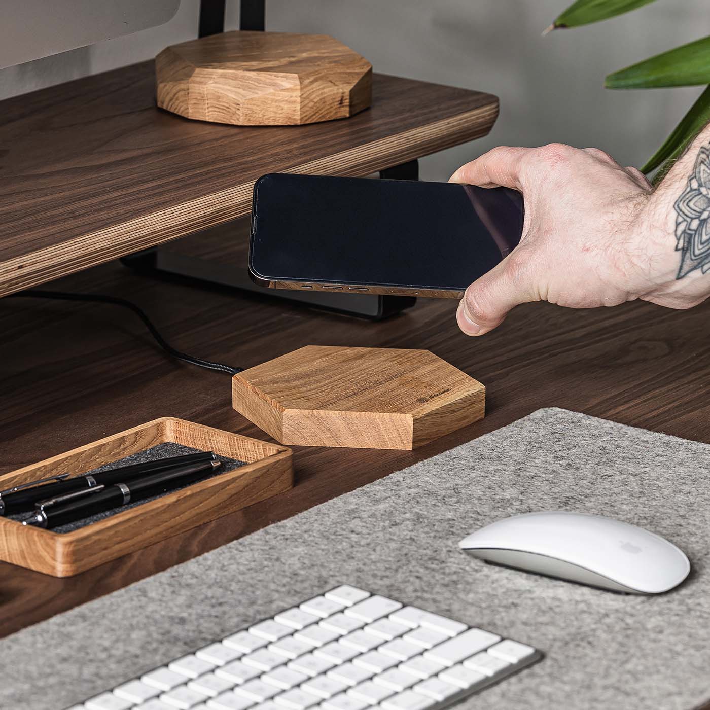 Holz wird seit jeher als Ikone des Designs betrachtet, und seine Accessoires dienen als einzigartige Elemente verschiedener Innenräume. Unser Holzladegerät verkörpert höchste Klasse und Individualität, die den stilvollen Charakter Ihres Zuhauses oder Büros unterstreichen wird.