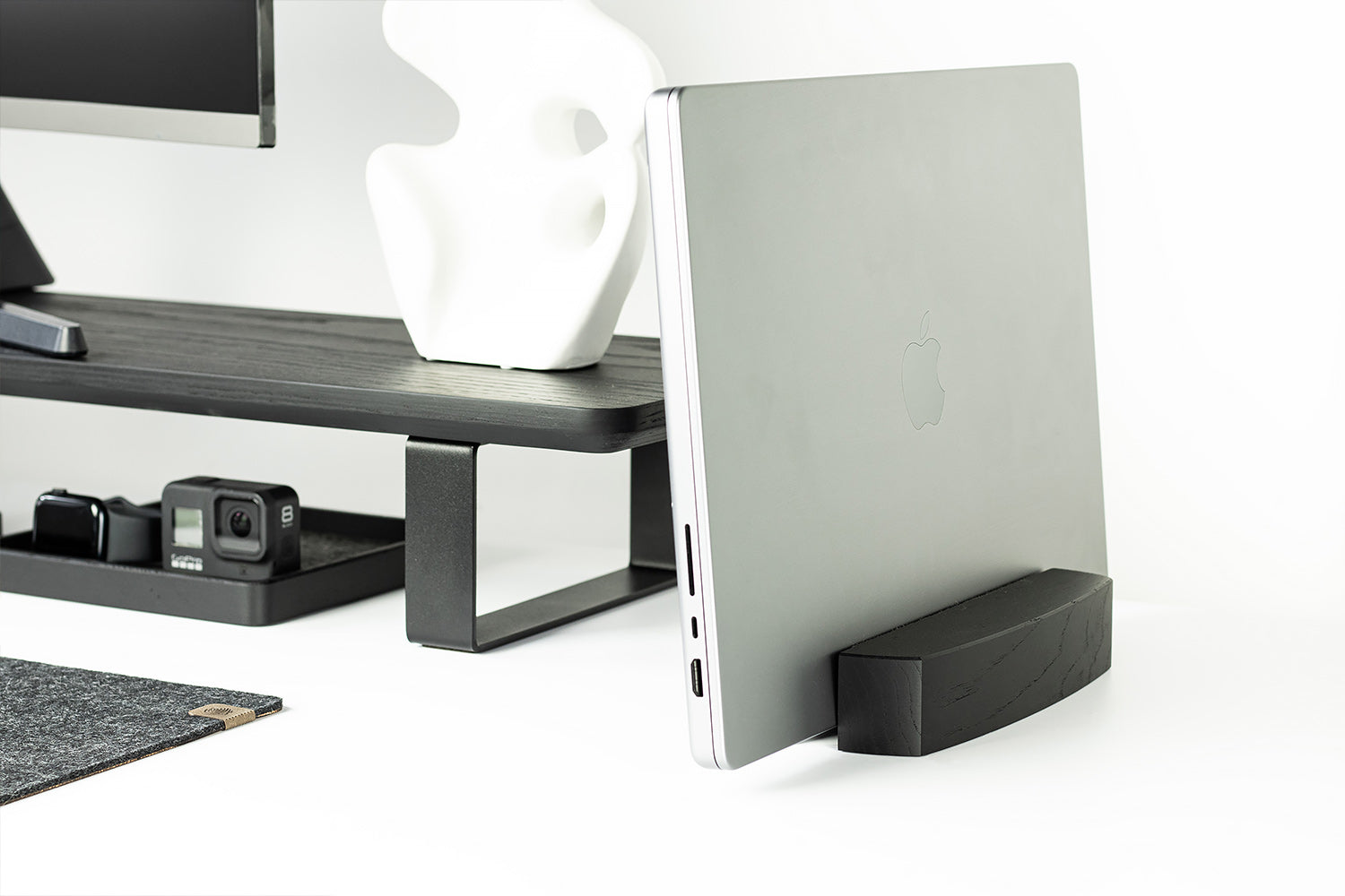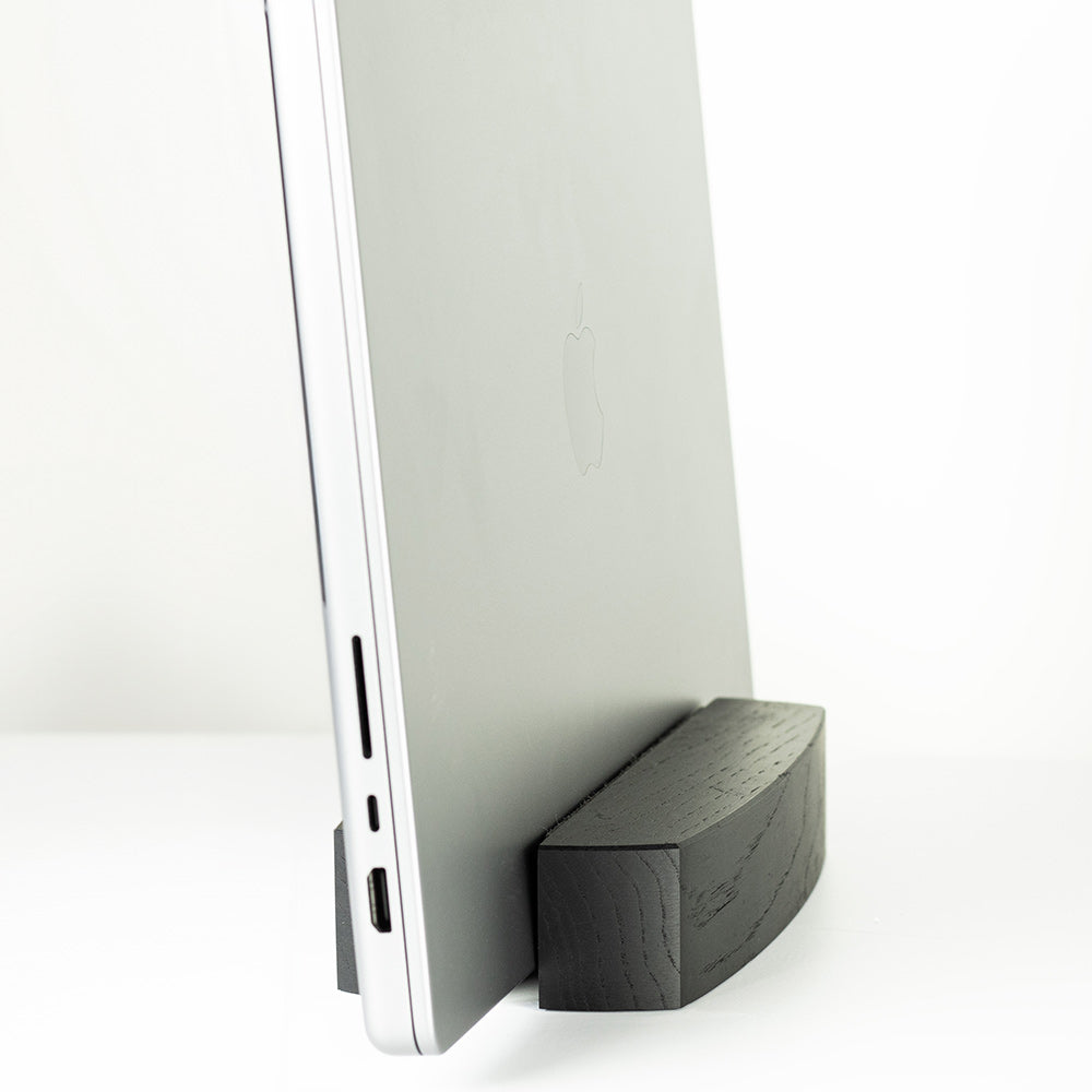Wir präsentieren den vertikalen Laptophalter aus wunderschöner schwarz lackierter Eiche, ein Muss für moderne Arbeitsplätze. Er wurde mit höchster Präzision entworfen und dient als ideale Aufbewahrungslösung für Laptops, MacBooks und Tablets.