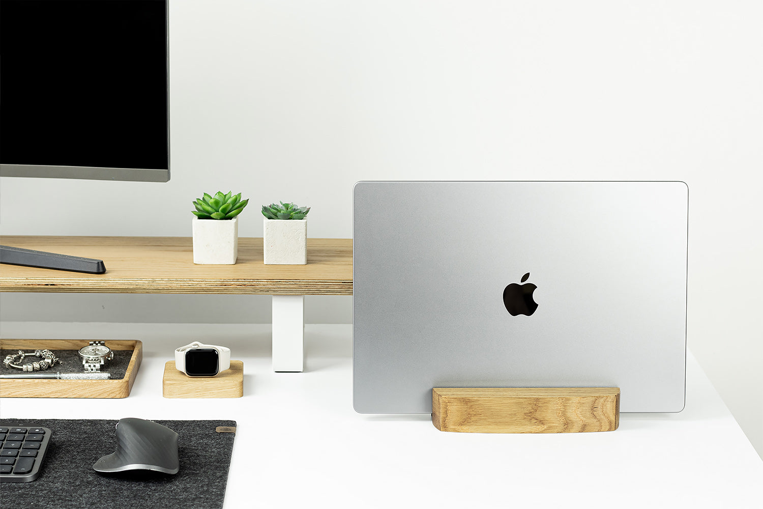 Durch die vertikale Aufbewahrung Ihres Laptops/Tablets sparen Sie Platz auf Ihrem Schreibtisch!