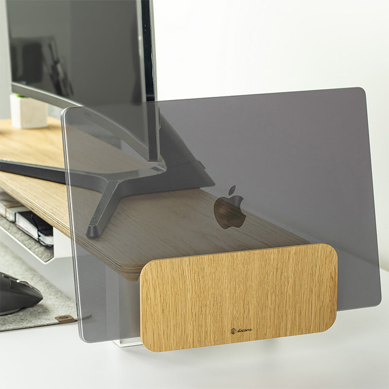 Mit seiner Holzfassade und dem mit Filz ausgekleideten Inneren bietet dieser elegante Ständer für Laptops oder Tablets eine modische Lösung, um Ihr Gerät vertikal aufzustellen. Der Ständer schützt nicht nur Ihren Laptop, sondern dient auch dazu, Ihren verfügbaren Schreibtischbereich optimal zu nutzen.