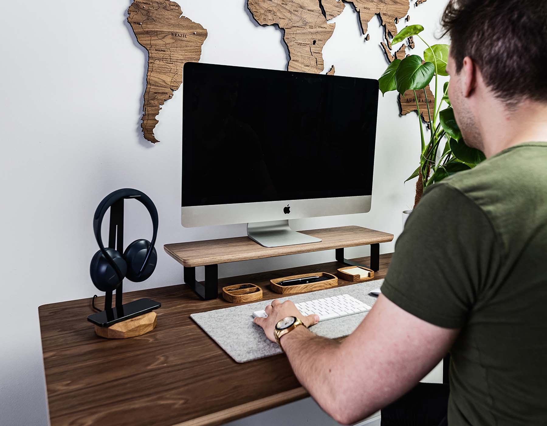Wir sind stolz darauf, ein weiteres Produkt von Discarve zur optimalen und funktionalen Gestaltung des Schreibtischbereichs vorzustellen. Dieser einzigartige Holzständer wurde entwickelt, um komfortable und sichere Arbeitsbedingungen mit einem einzelnen Monitor oder einem Breitbildmonitor zu gewährleisten. Der Ständer sorgt für eine ergonomische Positionierung der Bildschirme, indem er sie auf die geeignete Position, nämlich auf Augenhöhe, anhebt.