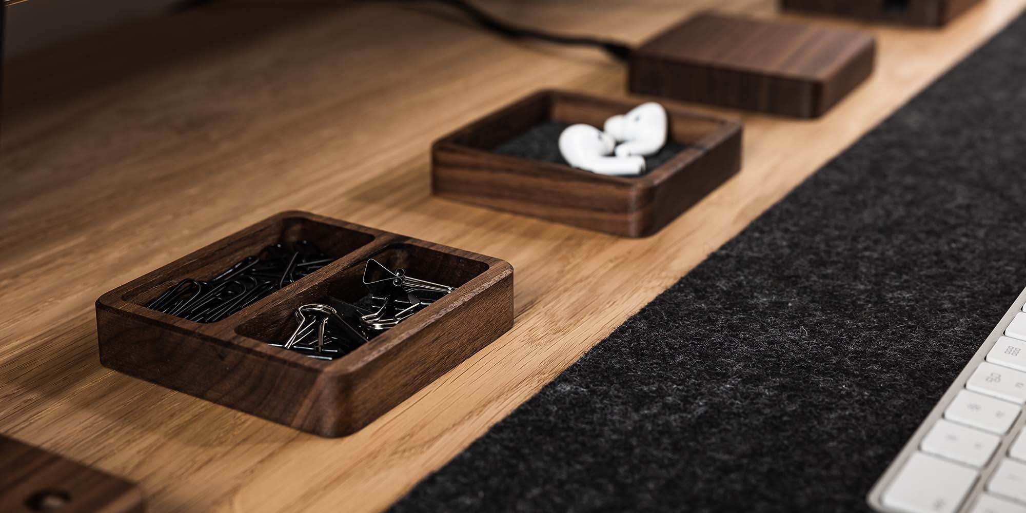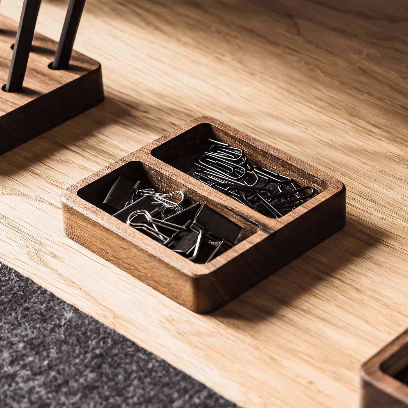 Funktional – ein Organizer aus Holz mit zwei Fächern zur Aufbewahrung kleiner Gegenstände wie Schlüssel, Kopfhörer usw. Dies ist ein weiterer von der Natur inspirierter Vorschlag von Discarve, mit dem Sie Ihren Traumarbeitsplatz organisieren können – mit einzigartiger Ästhetik und neuer Funktionalität selbst auf kleinem Raum.