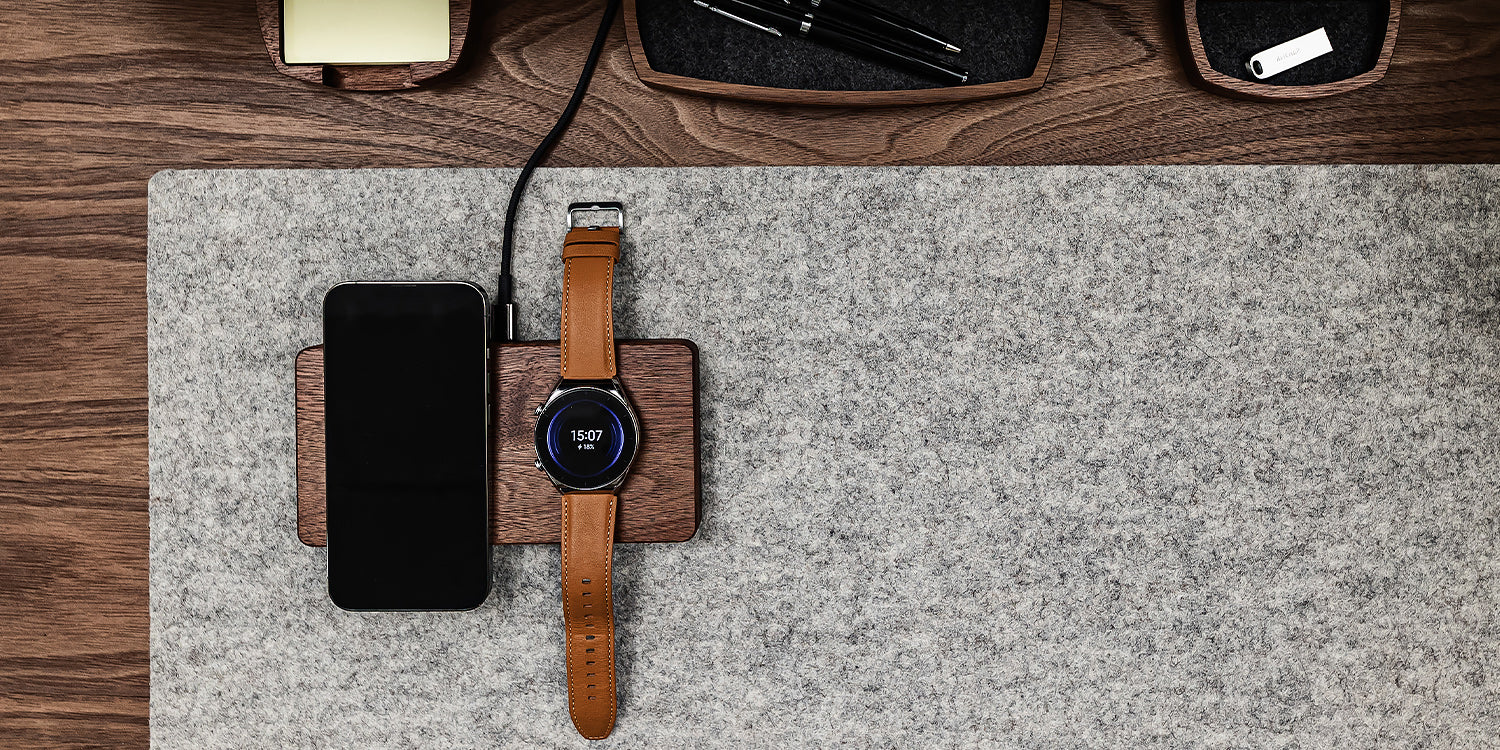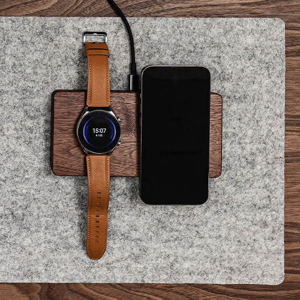 Das doppelte kabellose Ladegerät aus Holz ist mehr als nur ein Accessoire. Es ist eine harmonische Kombination aus sorgfältig ausgewähltem Holz, Kunst und Präzision. Es ist für diejenigen konzipiert, die mehr erwarten als nach Muster reproduzierte Ware.