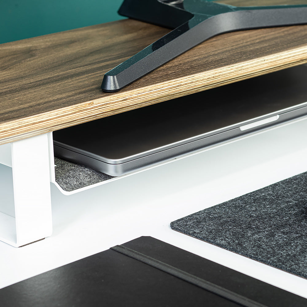 Unser für den Discarve-Monitorständer konzipiertes Metallregal mit Filzbezug bietet eine hervorragende Aufbewahrungslösung für Ihren Laptop, Ihr Tablet, Ihre Notizbücher, Bücher und andere Schreibtischutensilien. Seine robuste Konstruktion garantiert Haltbarkeit und Stabilität und verleiht Ihrem Arbeitsplatz gleichzeitig eine elegante und professionelle Ästhetik. Mit unserem Regal gewinnen Sie wertvollen zusätzlichen Platz unter Ihrem Monitorständer.